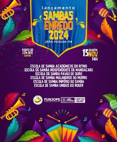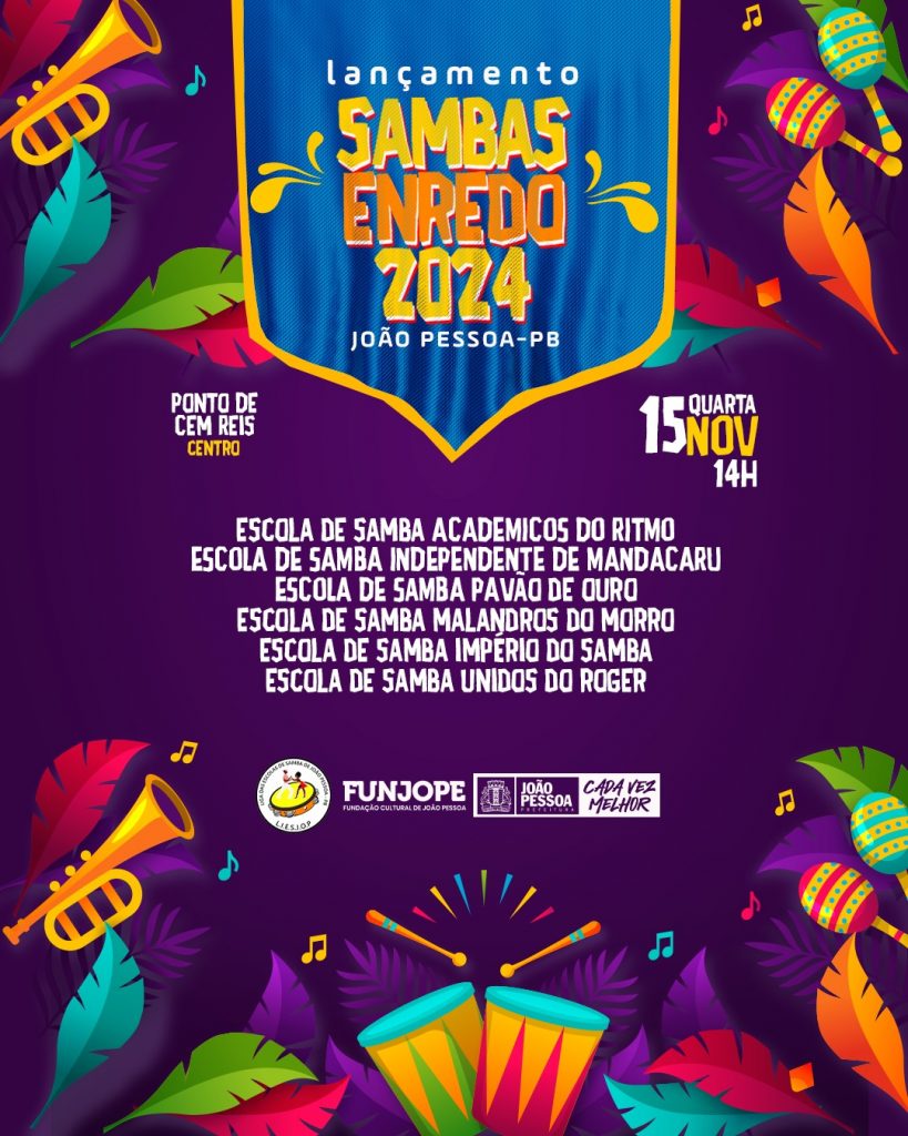 A Fundação Cultural de João Pessoa (Funjope) e a Liga das Escolas de Samba de João Pessoa estão organizando um evento, que acontece nesta quarta-feira (15), no Ponto de Cem Réis, a partir das 14h, para o lançamento dos sambas-enredos do Carnaval 2024 da Capital paraibana, com as seis escolas de samba do Carnaval Tradição de João Pessoa.
